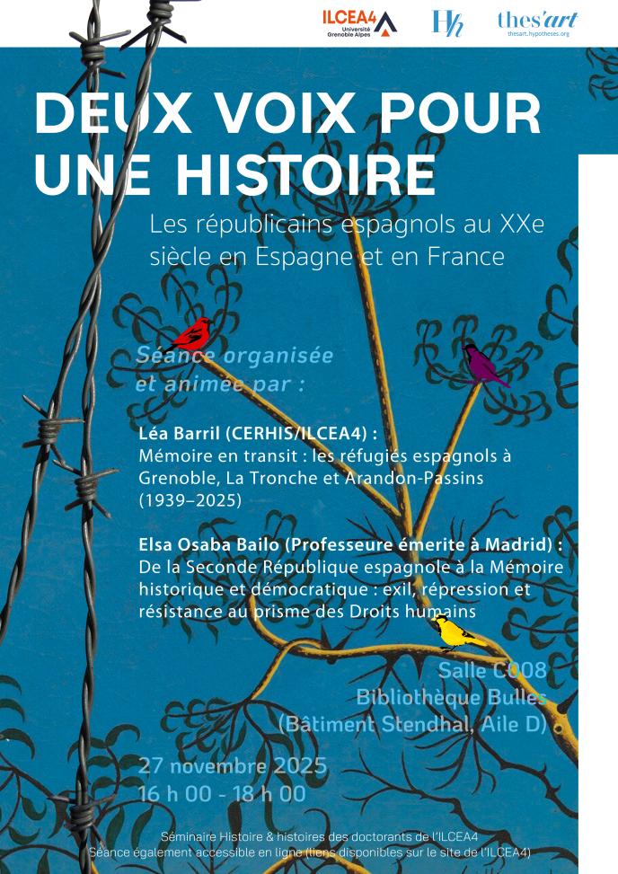Léa Barril : Doctorante en civilisation espagnole contemporaine, sous la direction de Madame Delgado Larios et de Monsieur Sesma Landrin. Léa Barril consacre ses recherches aux migrations espagnoles en Isère au XXᵉ siècle.